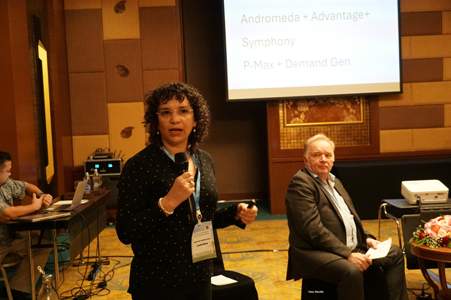 | Marianela compartió información sobre la inteligencia artificial incorporada en las plataformas de redes sociales. Foto: Recoftc | De izquierda a derecha: Kai Lintunen, Mary Ann Llanza y Paula Sarigumba. Foto: Recoftc |